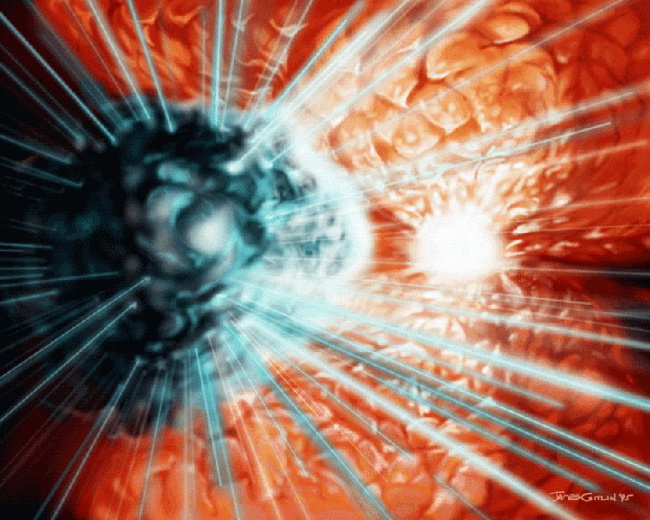 Courtesy of NASA at http://www.nasa.gov Nobody had heard about the great LASER light show in the sky until it was announced by a team led by K. Davidson (U. Michigan) and S. Johansson (U. Lund). The research team discovered that the unusually variable star Eta Carinae emits ultraviolet light of such a specific color it is most probably LASER light! The artist's conception shown depicts a possible model for the Hubble Space Telescope observations. In this model, Eta Carinae emits many LASER beams from its surrounding cloud of energized gas. This ultraviolet LASER is the first of its kind to be discovered. |