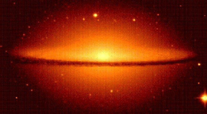 n10e-n-sombrero-galaxy-95_72TN.jpg Courtesy of NASA at http://www.nasa.gov The famous Sombrero galaxy (M104) is a bright, nearby spiral galaxy. The prominent dust lane and halo of stars and globular clusters give this galaxy its name. Something very energetic is going on in the Sombrero's center. Astronomers speculate that a black hole lies at the Sombrero's center, a black hole a billion times the mass of our Sun. This image was taken in blue light by the 0.9-meter telescope at Kitt Peak National Observatory. |