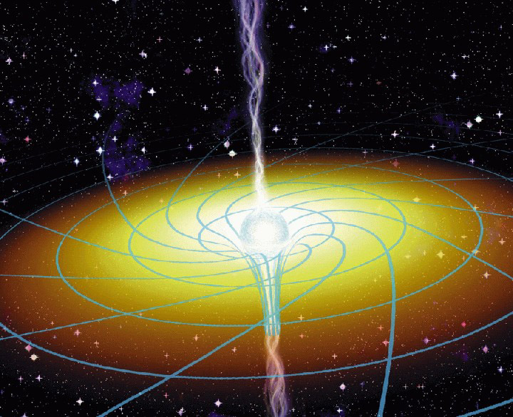 Courtesy of NASA at http://www.nasa.gov Gravity can do more than floor you. In a star system thought to contain a black hole, its gravity can spin you too. This frame dragging effect is most prominent near massive, fast-spinning objects. Now, a team led by W. Cui (MIT) has used the orbiting Rossi X-ray Timing Explorer to search for this effect and claims that matter in a system near a black hole gets caught up and spun around the black hole at just the rate expected from frame dragging at the rate that frame dragging occurs. Image: J. Bergeron, Sky & Telescope Magazine, and NASA |